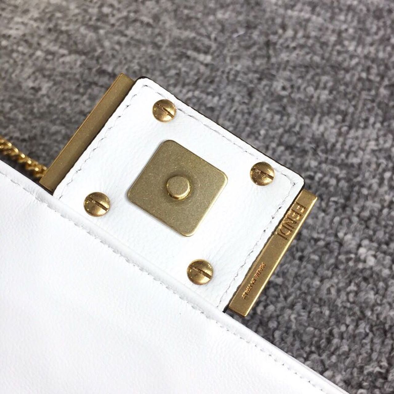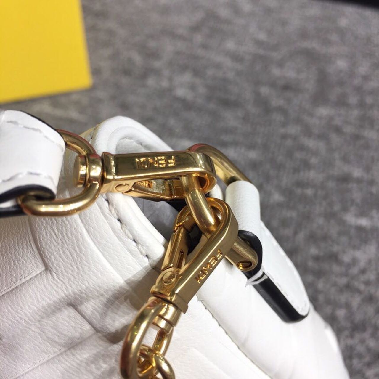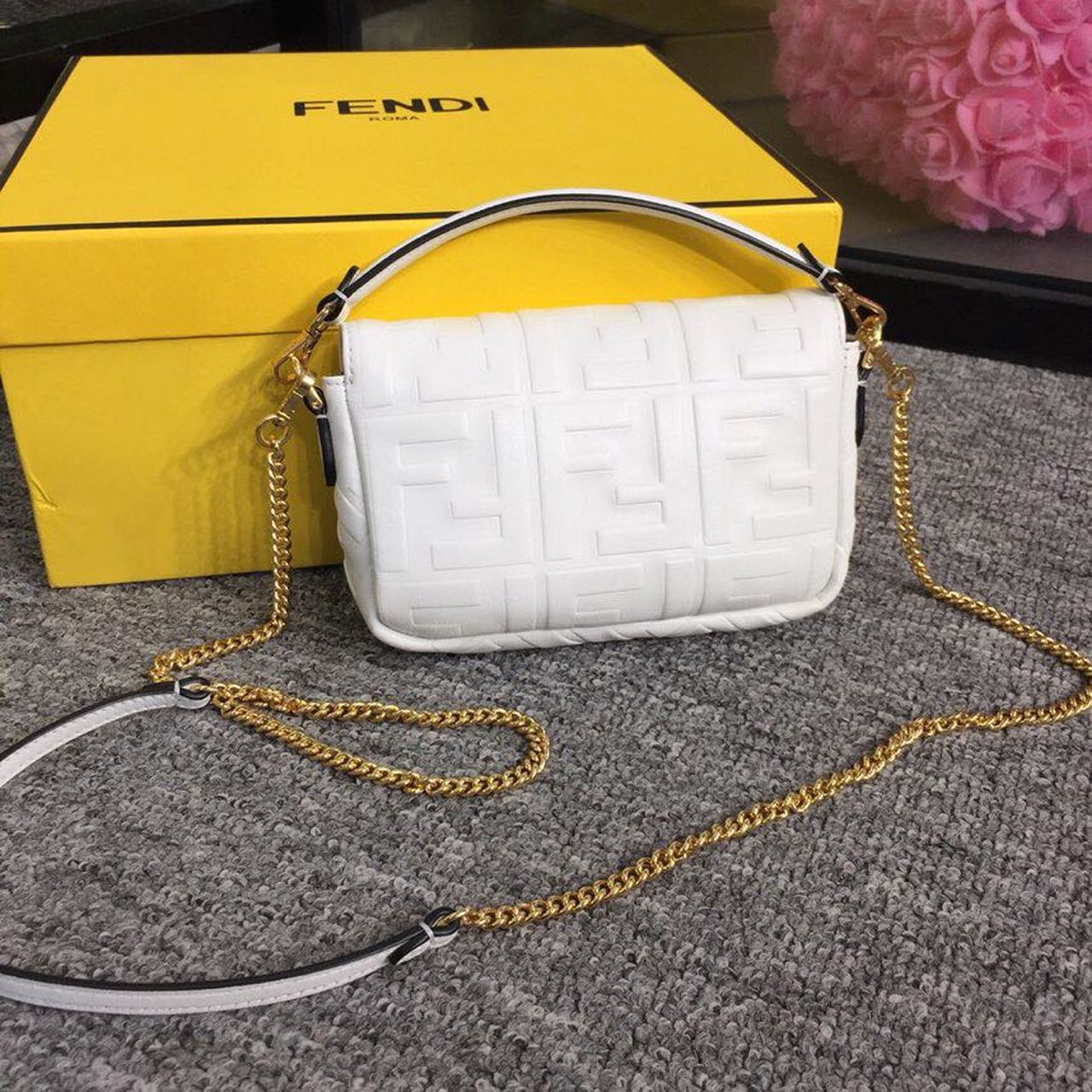 Iconic mini Baguette bag made of white soft nappa with a three-dimensional texture FF motif. Decorated with an FF clasp. The bag can be carried by hand, or worn either on the shoulder or cross-body thanks to the handle and chain shoulder strap, both detachable.