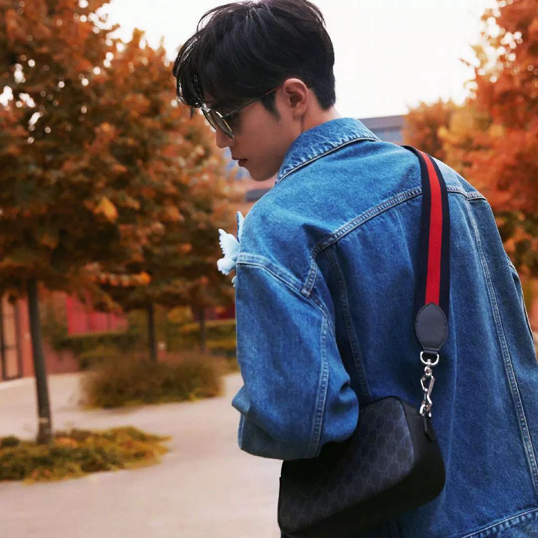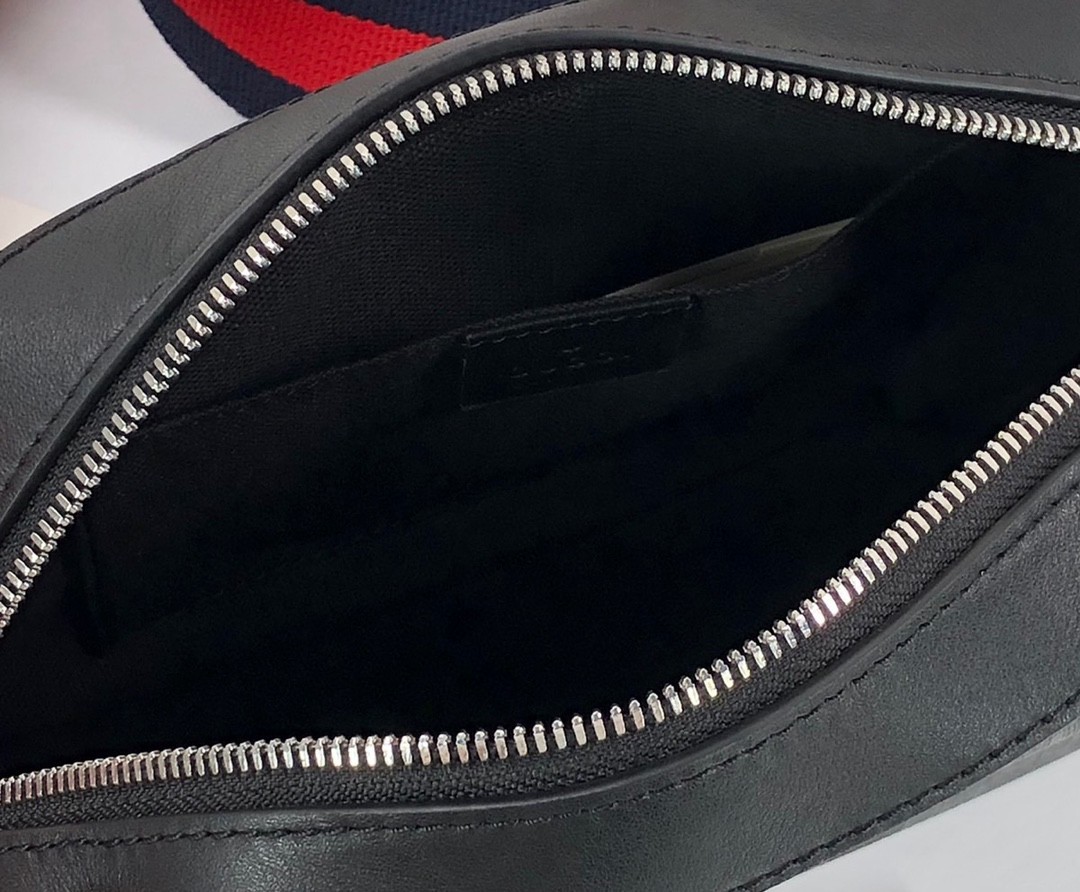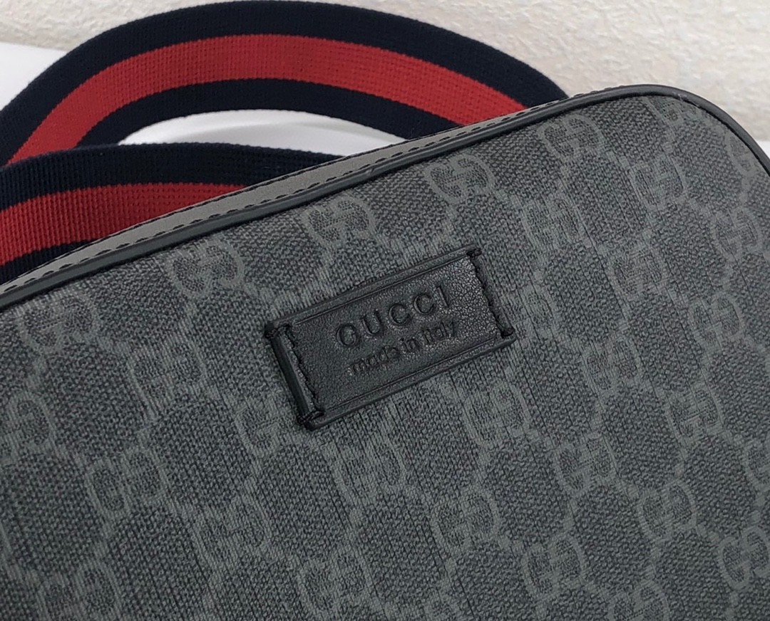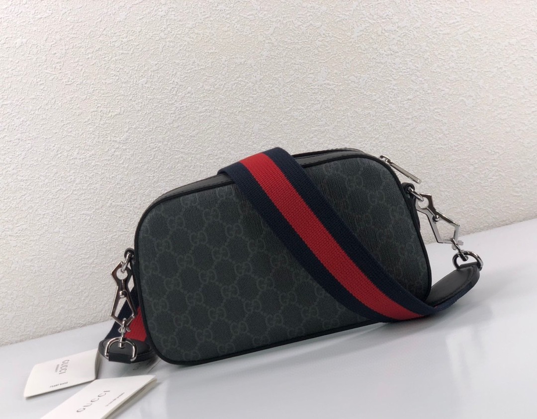 The small shoulder bag, designed with a softly structured rectangular shape that recalls traditional camera cases, in Gucci Supreme canvas. Presented in the black and grey combination of the House motif, the bag is completed with a wide nylon stripe in blue and red Web.