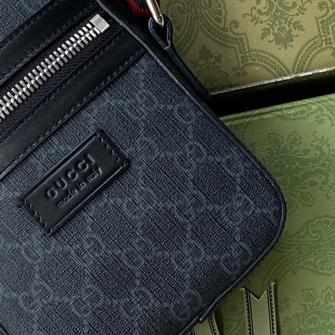 Presented in a black and grey combination, the Gucci motif takes on a contemporary look in a small messenger with front zip pocket. The design is further enriched with an adjustable nylon strap featuring the Web in blue and red.