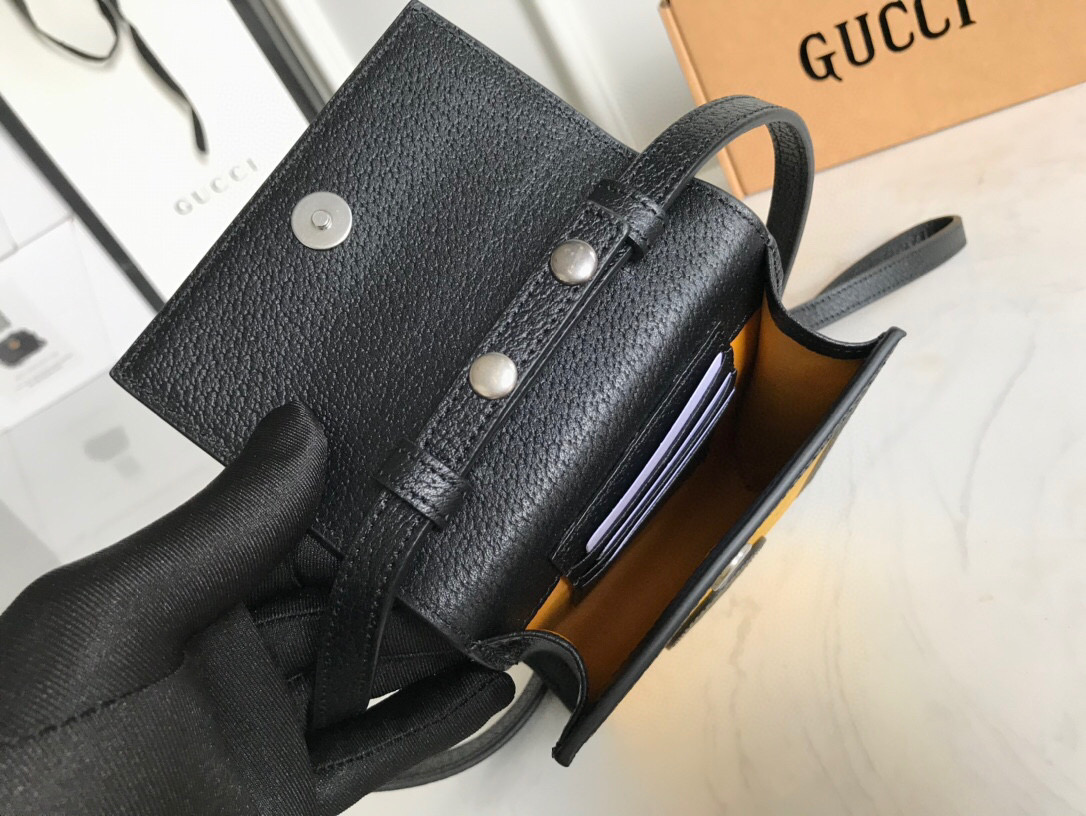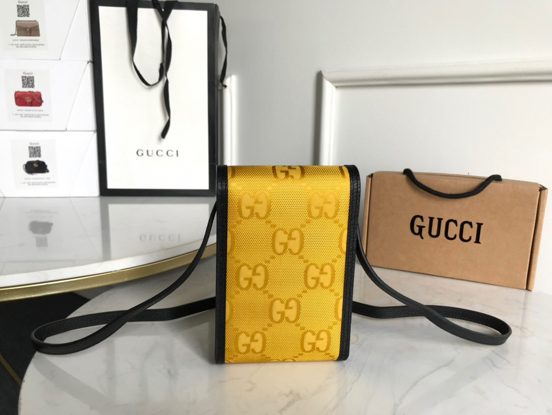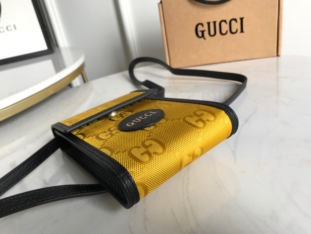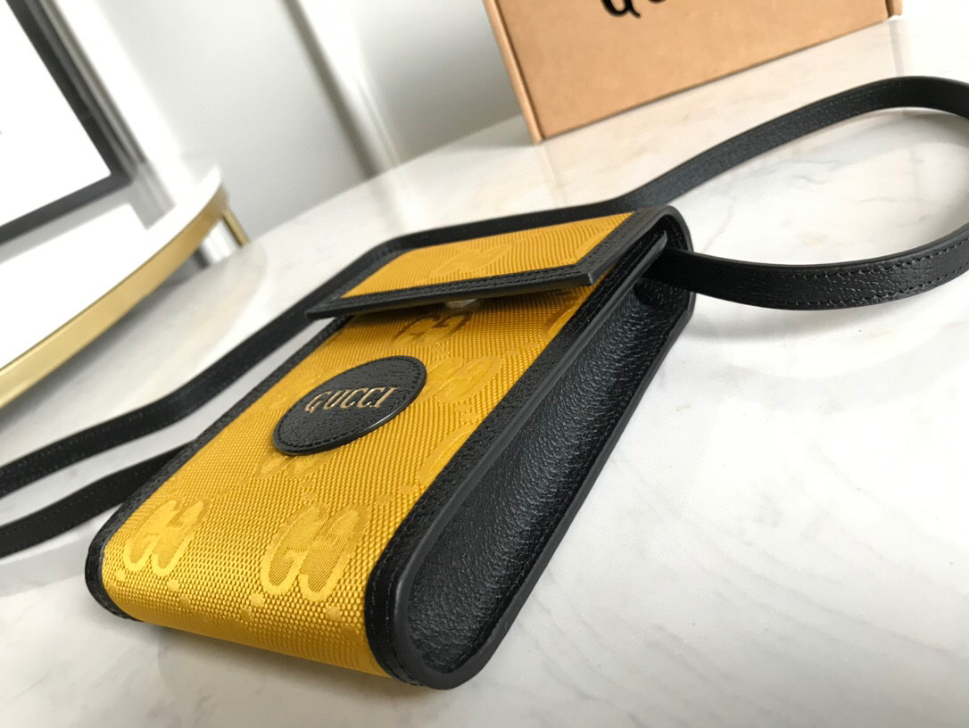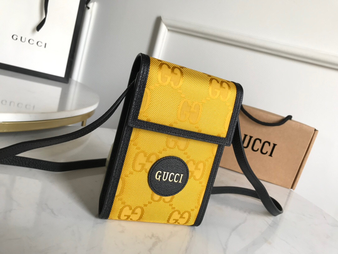 The mini bag is introduced within a line of accessories and ready-to-wear presented for Pre-Fall 2020 made from recycled materials and trims, supporting the House’s commitment to sustainability. Gucci Off The Grid is the first collection from Gucci Circular Lines a concept created to support the House’s vision for circular production. Designed for those mindful of their environmental impact, Gucci Off The Grid uses recycled, organic, bio-based and sustainably sourced materials. Regenerated nylon, crafted using recycled sewing thread and trims displays the Gucci pattern against an opaque background in yellow