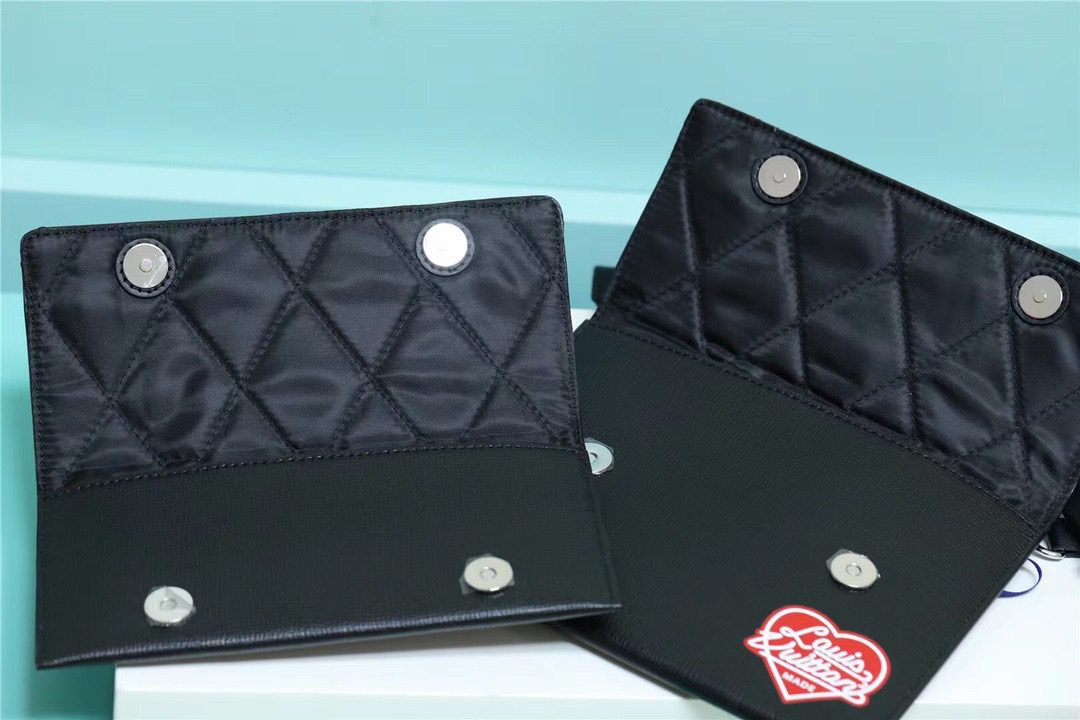 Inspired by the bestselling Trio Messenger, the cool, compact Trio Pouch was created by the Japanese designer Nigo for Pre-Spring 2022. His Monogram Drip look in denim and Taurillon is accented with scarlet hearts for a colorful signature. Three bags in one, it features two removable pouches plus a removable cardholder on the strap – perfect for contactless payment.