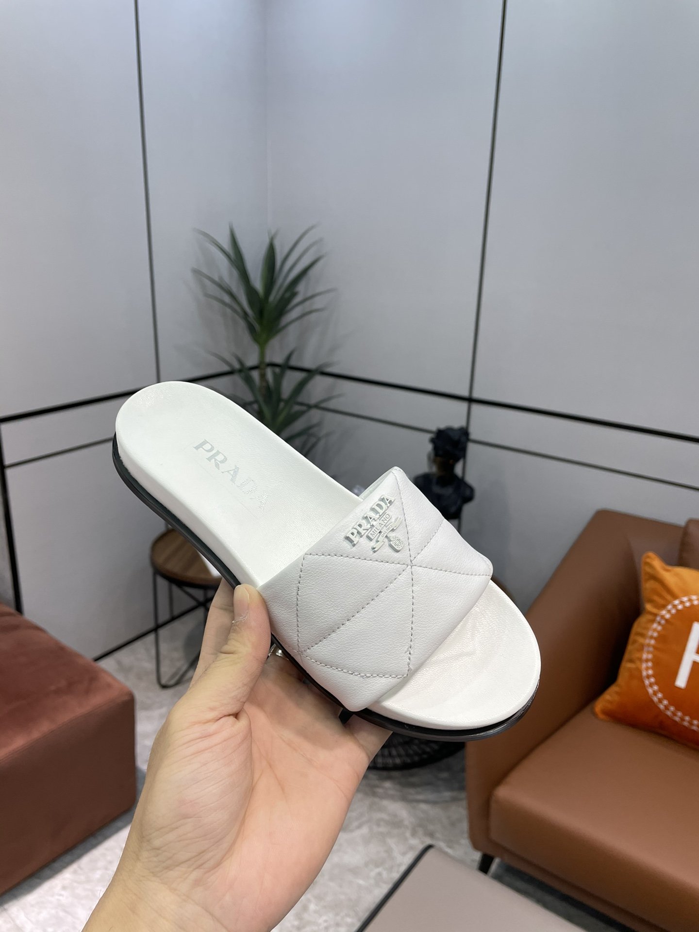 white embossed logo quilted slides from Prada featuring quilted,