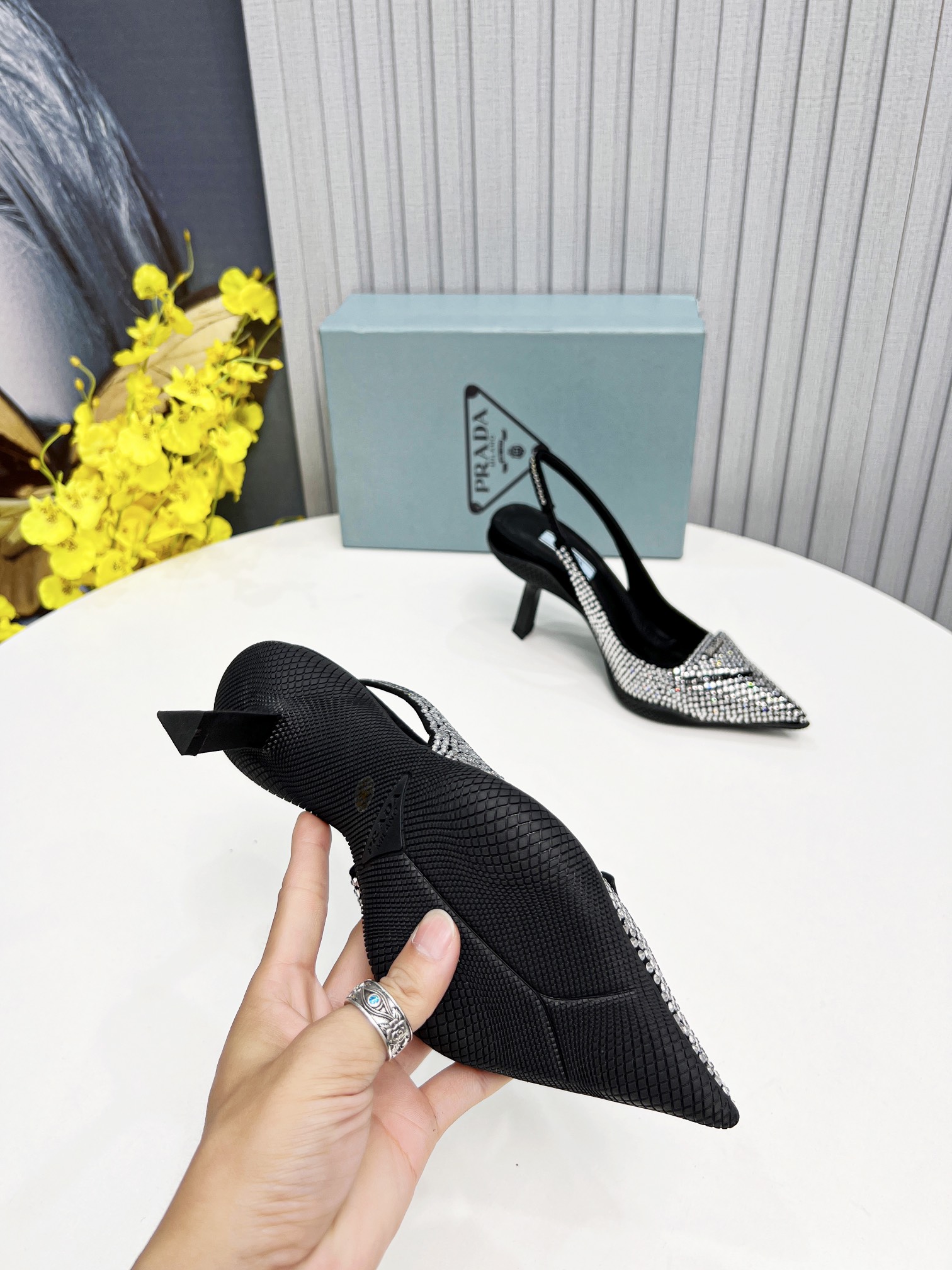 Among Prada’s distinctive designs, the slingback pump is presented in a precious new version in crystal-studded satin, with iridescent glimmers and plays of light. As a new variation, the iconic triangle is transformed in a slightly padded detail.